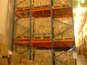 后推式貨架系統(tǒng)(也稱為壓入式貨架),此貨架系統(tǒng)高效地利用了存儲空間,經(jīng)常用為物流中心貨架。依據(jù)“先進后出”的原則把貨物放置在傾斜的滾道上,運載臺車沿軌道運行,托盤放置在運載臺車上依次被后推至貨架內(nèi)部,有效深度在5個托盤位,取貨時第一個拉盤提取后,下一個托盤自行滑至取貨點,有效地利用單一通道進行存取,尤其適用于貨物中轉(zhuǎn)區(qū)的存儲管理。