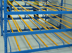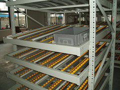 滾輪式料架簡稱流利架,是將貨物置于滾輪上,利用一邊通道存貨,另一邊通道取貨。料架朝出貨方向向下傾斜,貨物在重力作用下向下滑動?蓪崿F(xiàn)先進先出,并可實現(xiàn)一次補貨,多次揀貨。流利架存儲效率高,適合大量貨